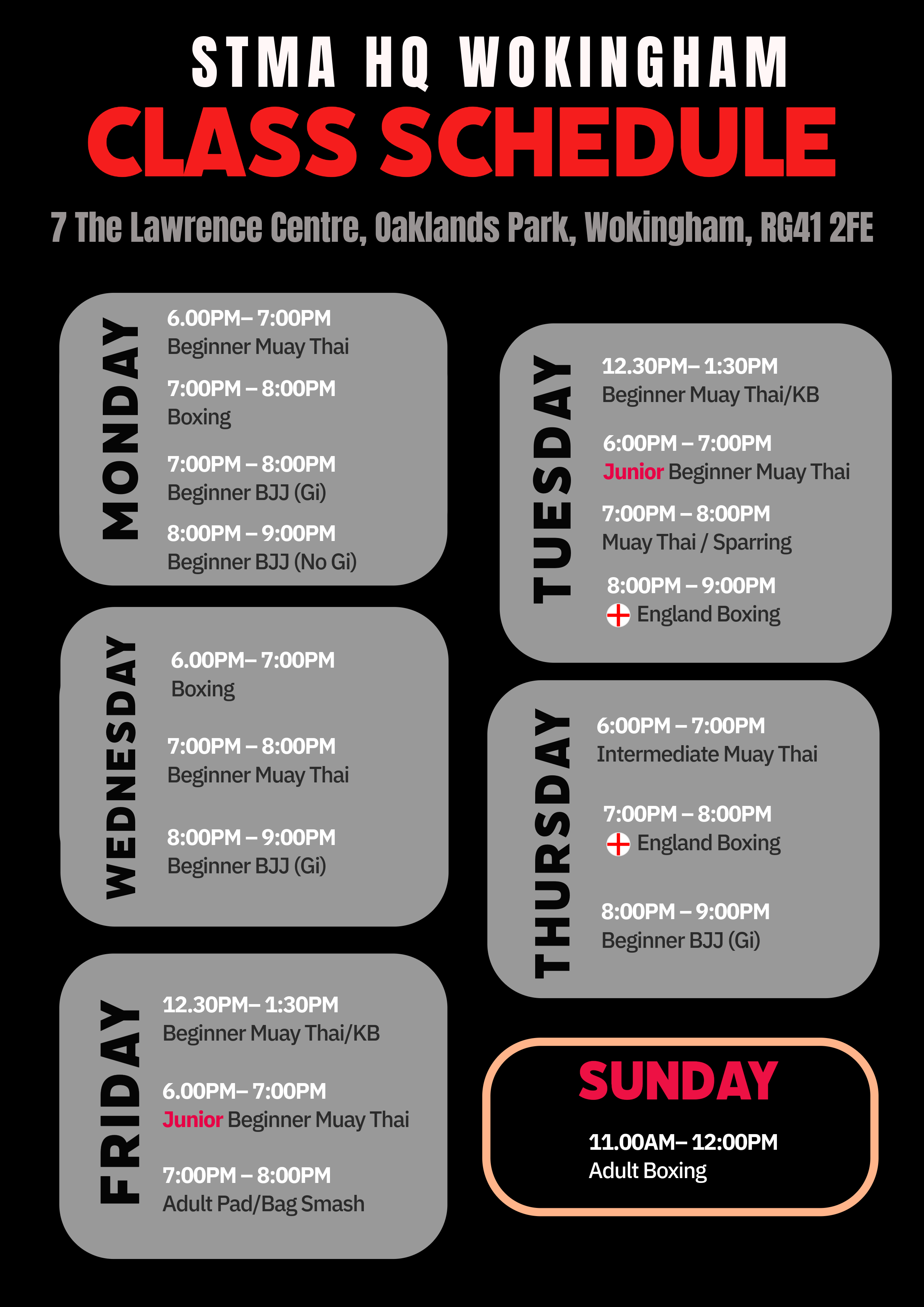 Shaolin Tigers STMA Wokingham’s classes for this week listed below.